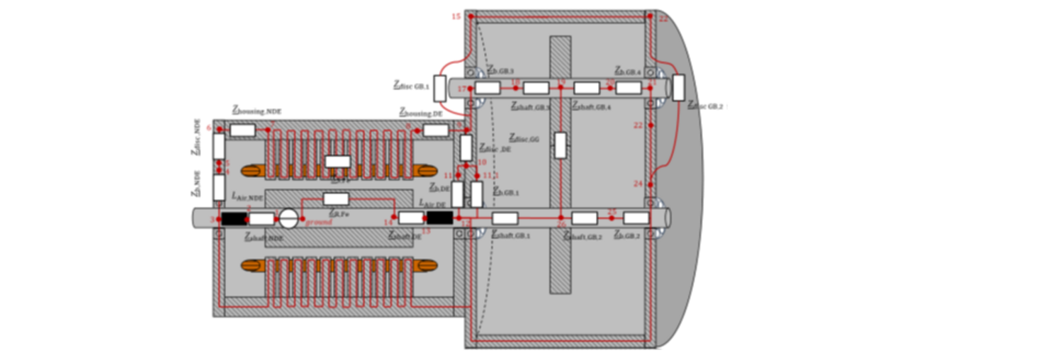 Der drehzahlvariable Betrieb einer elektrischen Maschine mittels schnellschaltender Wechselrichter bringt nicht nur eine hohe Dynamik und geringe Schaltverluste, sondern auch unerwünschte parasitäre Effekte mit sich. In Folge steiler Spannungsgradienten und hoher Schaltfrequenzen wird eine Common-Mode-Spannung in die Statorwicklung einer elektrischen Maschine eingeprägt. Durch die parasitären kapazitiven und induktiven Kopplungen der elektrischen Maschine können durch die Common-Mode-Spannung zirkulare Lagerströme, Rotorerdströme oder EDM-Lagerströme im Motor und Getriebe des Antriebssystems auftreten und dort die Lager und den Zahnradeingriff beschädigen.